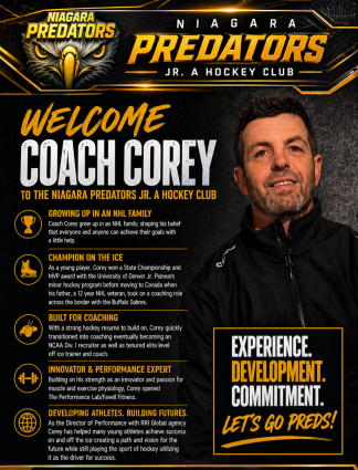 The Niagara Predators Jr. A Hockey Club are proud to welcome Coach Corey to the organization.